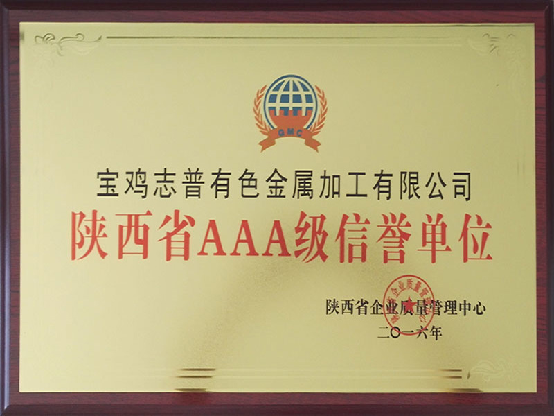 2016年7月,寶雞志普有色金屬加工有限公司被陜西省質(zhì)量管理中心授予陜西省AAA級信譽單位。